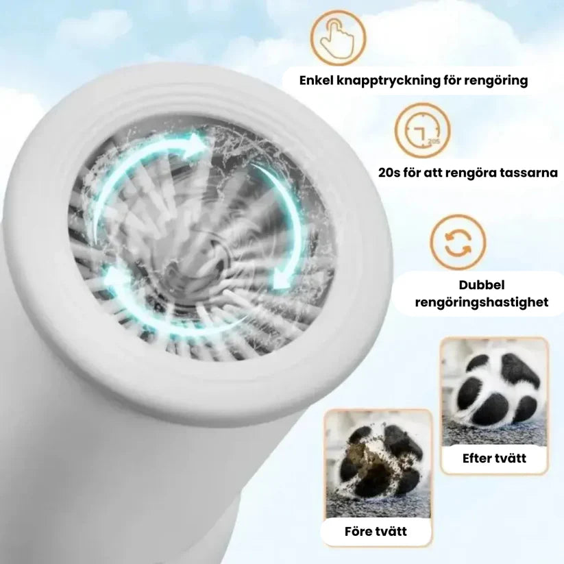 - Snabb och Automatisk Rengöring: Starta med ett knapptryck och låt de mjuka, roterande borstarna effektivt rengöra tassarna.